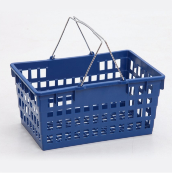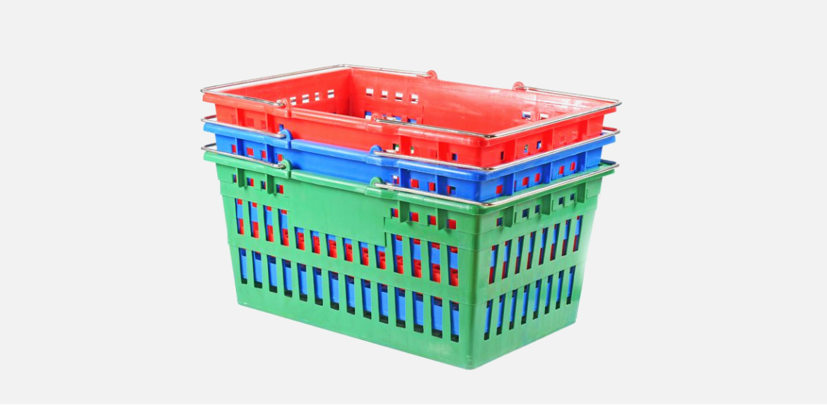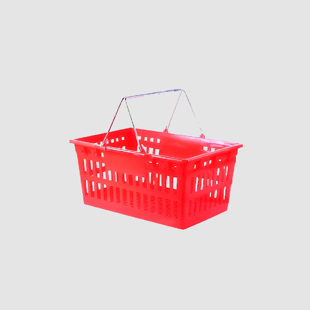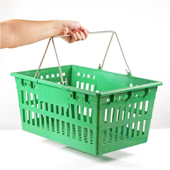 Canasto de plástico para supermercado, autoservicio, almacén, verdulería con manijas de acero.